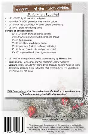 Finished 16 x 38 in. Super cute, easy beginner friendly fusible web applique and a cinch to kit. Let the machine blanket stitching serve as most of your quilting. Then use sewing machine to free motion a few swirls between the gnomes and trees, and finish off with straight stitching along the outer borders. You CAN do this all on your sewing machine. Add some fun to your table for winter and holidays with appliqued gnomes in buffalo check. Well written pattern includes enlarged layout and stitch guide so you can see how I quilted it. I assume nothing and explain everything, making this perfect for quilters of any skill level.