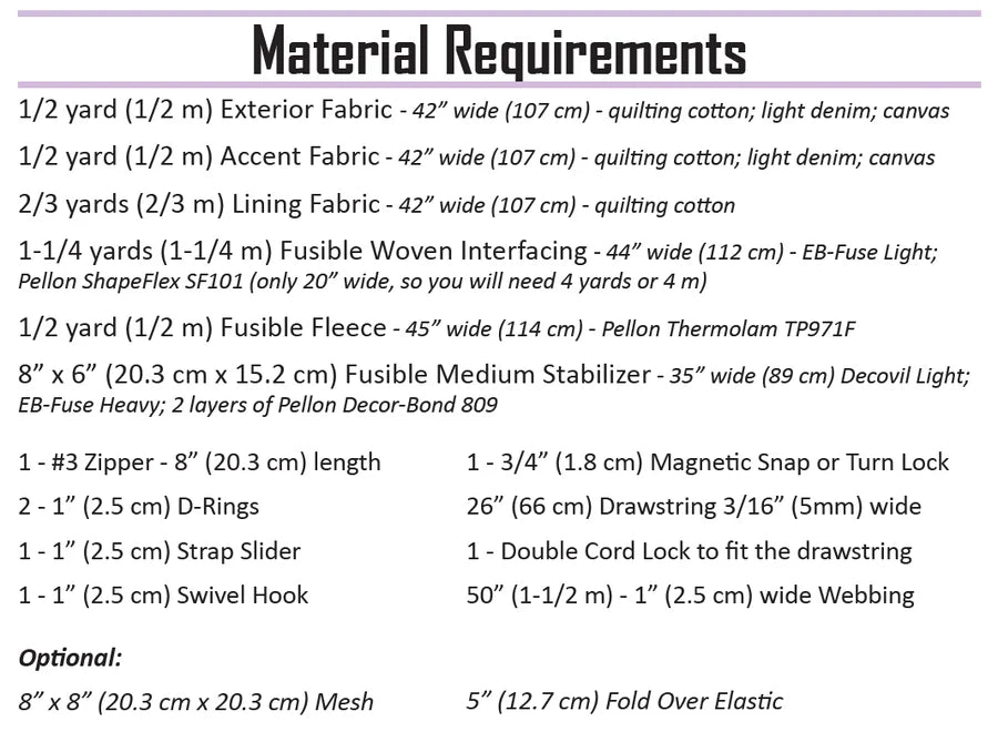 The pattern was designed for quilting cotton, light canvas, or light denim and is designed to be made on a domestic sewing machine!