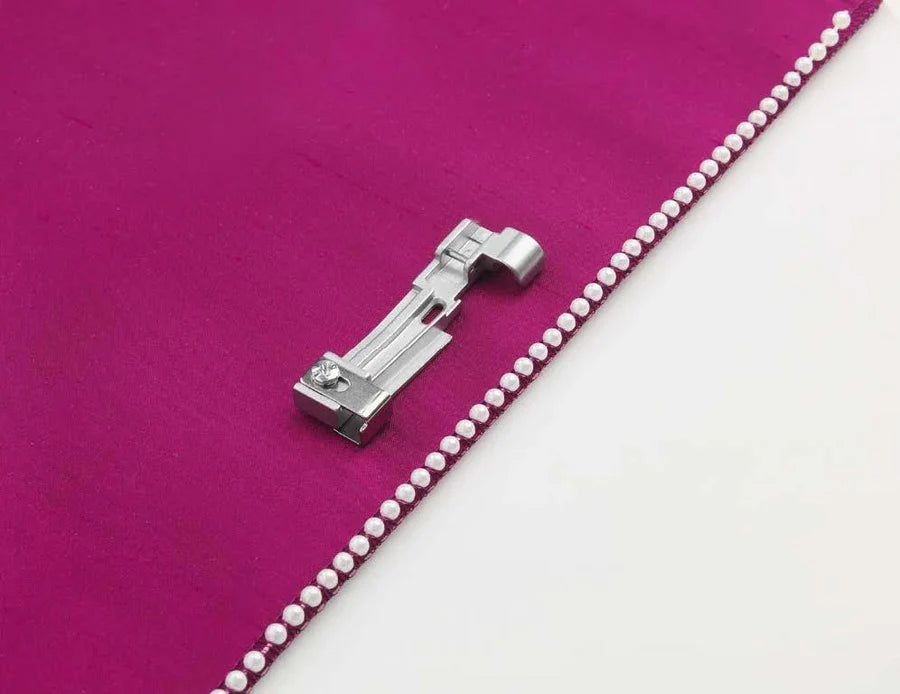 The Beading Foot smoothly guides beads and pearls through a channel on the foot for easy application on garments or crafts.