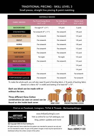 Mini Coos - a Highland Cow Quilt Pattern Skill level 3/3 - confident piecer Introducing a new and fresh take on our famous Cattle Call Quilt Pattern! This fun quilt is 52.5" x 62.5" and features adorable highland coos in a mini format. It also includes optional Scottish tams (hats) to accessorize your coos. The quilt includes two types of coo blocks: the front-facing coos looking in two directions (10.5" x 15" finished) and the side coo (15" x 15" finished). You can make each coo with or without the Scottish tam. Additionally, the pattern includes two different thistle blocks to create the borders. The coo blocks are versatile and can be used in other projects, such as tote bags, runners, jackets, and more! We designed this quilt using traditional piecing techniques, so no paper piecing is involved. The quilt requires precision piecing, with small pieces, straight-line sewing, and some points to match. The pattern comes in full colour and is saddle-stitched with a soft laminate cover, spanning 34 pages. This quilt is too cute not to make, so get MOOOOOving!