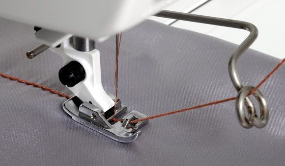 1. Place the yarn or trim into the hook/guide on the front of the foot and under the foot.